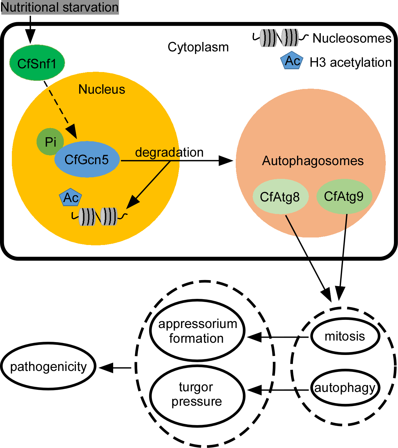 本研究利用转录组测序技术发现CfGcn5调控大量基因的表达,其中包括大部分细胞自噬相关基因。进一步研究发现,CfGcn5负调控细胞自噬过程,且该调控过程依赖于CfGcn5的磷酸化及对组蛋白H3的乙酰化。通过对细胞自噬核心蛋白CfAtg8和CfAtg9的生物学功能分析发现,CfAtg8和CfAtg9通过参与有丝分裂及细胞自噬控制功能性附着胞的形成,进而调控病菌的致病过程。CfGcn5则通过自身的降解减轻对细胞自噬的抑制作用,进而促进病菌侵染。该研究通过对CfGcn5在细胞自噬和致病过程中的作用机理解析,拓展了人们对刺盘孢属真菌致病分子机制的认识,同时对防控植物炭疽病新型药剂的研发提供了潜在的靶标位点。