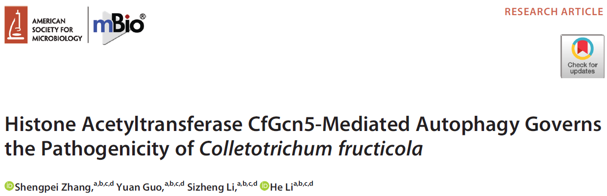 2022年8月17日,生物学领域TOP期刊《mBio》(中科院一区,IF: 7.786)在线发表了中南林业科技大学森林保护团队题为“Histone Acetyltransferase CfGcn5-Mediated Autophagy Governs the Pathogenicity of Colletotrichum fructicola”的研究论文。文章报道了组蛋白乙酰转移酶CfGcn5负调控果生刺盘孢致病过程中至关重要的细胞自噬,并通过自身降解减轻对细胞自噬的抑制作用,从而促进病菌对油茶的侵染。