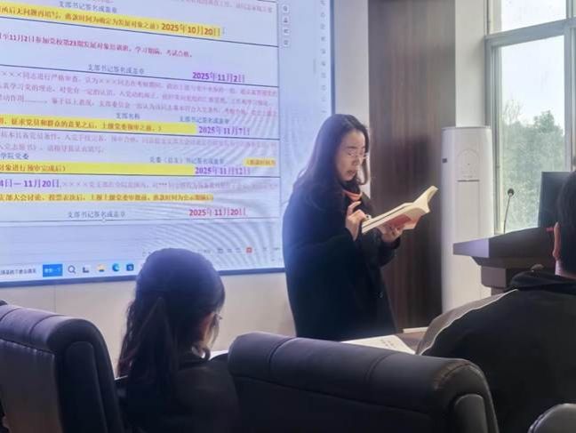 学院党委副书记陈慧慧依据《中国共产党发展党员工作流程图》并结合学院实际,对发展党员工作全流程进行了系统梳理与讲解。她强调,党员发展工作是党的建设基础性工程,材料填写是其中的关键环节,直接关系到党员发展的严肃性与规范性。陈慧慧要求全体党务工作者牢固树立责任意识和程序意识,准确把握材料填写的各项规范与时序要求,以严谨细致的态度做好党员发展过程中的每一份材料,切实保障党员发展质量。