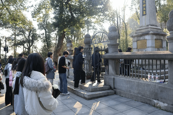 活动伊始,全体党员从岳麓山东门整装出发,依次前往黄兴墓与蔡锷墓,举行庄严肃穆的祭扫仪式。主持人饱含深情地讲述了黄兴、蔡锷等近代民主革命先驱,为民族独立、国家富强矢志奋斗的光辉事迹。师生党员列队整齐,向革命先烈敬献鲜花、肃立默哀,随后缓步绕墓瞻仰。肃穆的氛围中,大家深切缅怀革命先辈的不朽功勋,感悟峥嵘岁月里的家国情怀与矢志不渝的革命精神。