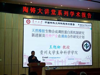 王旭初教授是国家高层次人才特殊支持计划领军人才、科技部中青年科技领军人才、享受国务院特殊津贴专家。报告中,他系统介绍了其团队二十余年来在天然橡胶合成调控蛋白质机制领域的研究成果,重点阐述了巴西橡胶树、杜仲和橡胶草三种产胶植物的分子育种进展,并详细说明了杜仲在湖南综合利用的合作研究方案。