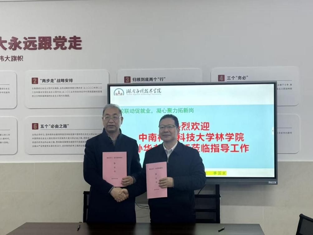随后,学院一行来到湖南应用技术学院。该校是我校硕士、博士研究生优质就业单位,近年来已有多名高层次毕业生在此任教或从事科研管理工作。本次走访中,学院重点考察了农林科技学院,与农林科技学院院长及骨干教师就林学专业人才输送、教学方案优化设计等合作事项进行了充分沟通。孙华书记表示,希望以此次走访为契机,进一步打通两校间人才交流与培养的通道。座谈结束后,双方代表共同签订了就业实习基地建设协议,为今后学生实习实践、毕业生就业拓展了新的平台。