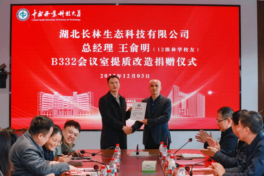 2025年12月3日下午,中南林业科技大学林学院校友捐赠仪式在树木楼B332会议室举行。学校副校长刘高强教授,校友事务与发展联络处处长严爱军、副处长欧阳钦,林学院院长袁德义、党委书记孙华及学院领导班子成员,湖北长林生态科技有限公司总经理王俞明、长沙市长长林业技术咨询有限责任公司总经理和晓风两位校友,以及学院教师代表、学生代表参会,仪式由孙华主持。