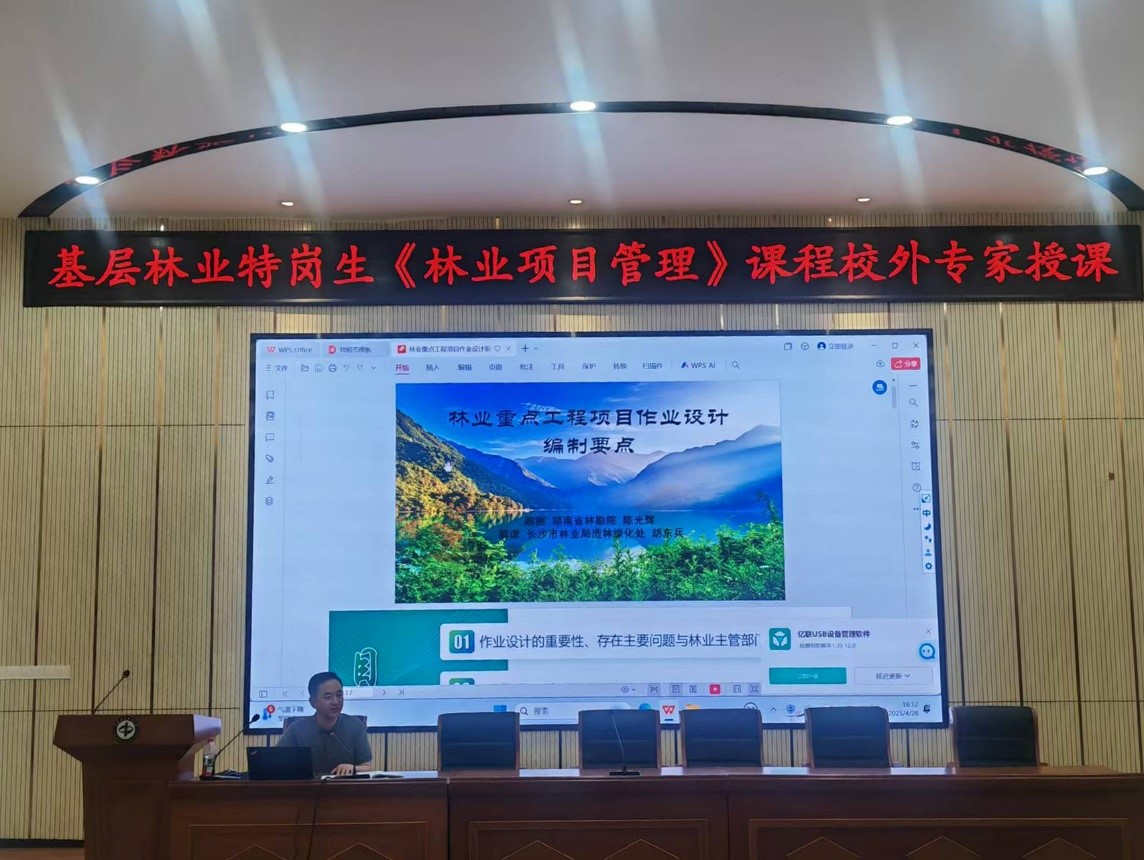 4月28日下午,长沙市林业局造林处胡东兵处长应邀为我院 2023级林业特岗生《林业项目管理实务与案例》课程授课,胡东兵处长以《林业重点工程项目作业设计编制要点》为题,分享一线经验,提升学生项目管理能力,为基层林业培养专业人才 。