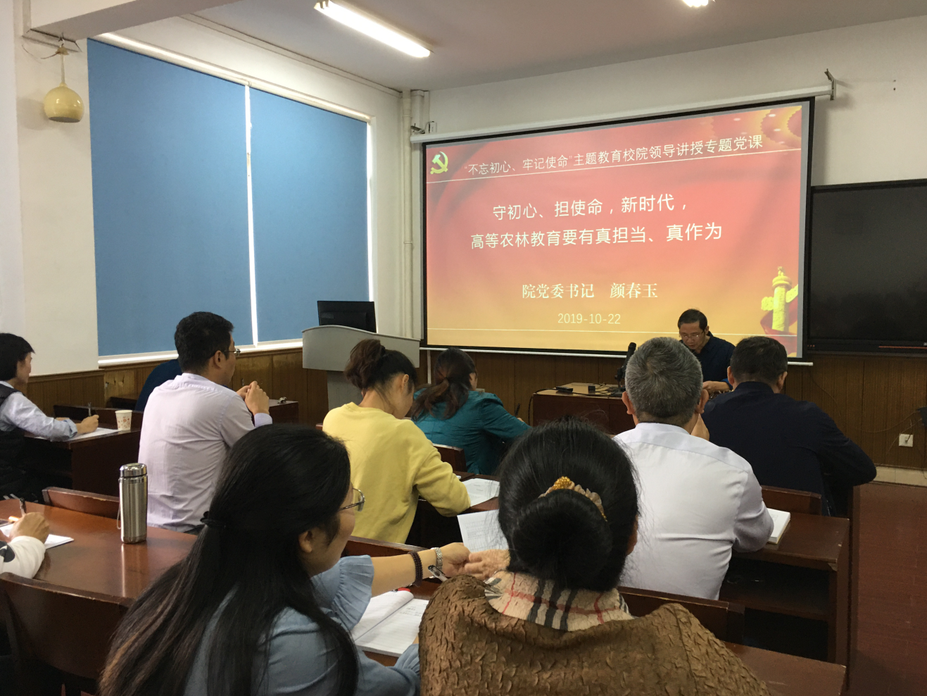 2019年10月22日上午,林学院党委书记颜春玉在林学院报告厅,以《不忘初心、牢记使命,新时代高等农林教育要有真担当、真作为》为题,讲授“不忘初心、牢记使命”主题教育专题党课。林学院全领导班子、全体教职工党员、学生党员代表参加了专题党课学习。