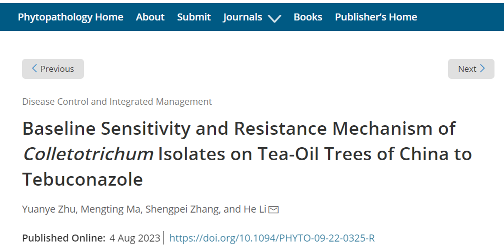 近日,国际植物病理学TOP期刊《Phytopathology》发表了森林保护团队题为“Baseline Sensitivity and Resistance Mechanism of Colletotrichum Isolates on Tea-Oil Trees of China to Tebuconazole”的研究论文。文章报道了油茶炭疽病菌对DMI类杀菌剂新的抗性机制。